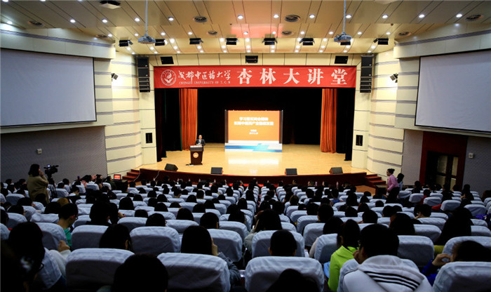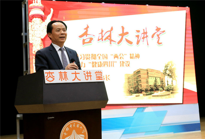 3月29日下午,由学校党委宣传部、科技处、校团委、药学院联合主办的2017年beat365在线唯一官网“杏林大讲堂”首堂讲座在温江校区百会堂举行,特别邀请人大代表耿褔能为全校师生传达2017年全国“两会”精神。讲座由学校副校长彭成主持。