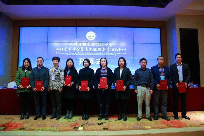 四川省糖尿病防治协会会长、眼科学院院长段俊国教授为开幕式致辞,并做了协会2016年工作总结与未来工作规划,对新成立的糖尿病早期筛查专业委员会和糖尿病健康教育专业委员会表示祝贺。他同时也指出我省糖尿病防控形势严峻,号召省糖尿病协会全体会员要在省卫计委等有关部门的领导下团结全省糖尿病领域医生、护士、营养师、企业家和病人,一道提高我省糖尿病防控的总体水平,降低糖尿病的发病率、致残率和致死率,为“健康中国”和全面实现小康社会做出应有的贡献。