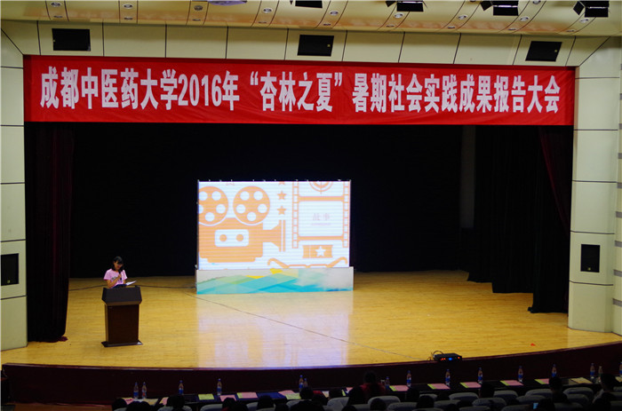 11月17日下午,学校2016年“杏林之夏”暑期社会实践成果报告大会在百会堂演播大厅举行。学生处、校团委、针灸推拿学院、医学技术学院、医学信息工程学院相关领导和老师及得荣县人大常委会主任阿郎出席了报告会。来自各实践小分队的代表及四川农业大学学生代表近400人参加了会议。