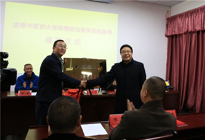 沈涛在基地挂牌仪式上发表讲话,代表学校感谢邛崃市各级政府对学校事业发展的大力支持。他简要回顾80年前中国共产党领导红军主力部队胜利完成震撼世界、彪炳史册的长征并指出,红军长征邛崃纪念馆是难得的师生思想政治教育基地,在增强师生思想政治教育工作针对性、实效性和吸引力、感染力上具有重要作用。学校与纪念馆共建思想政治教育基地,是深入贯彻落实《中共中央国务院关于进一步加强和改进大学生思想政治教育工作的意见》等文件精神、深化师生思想政治教育工作的重要举措,也是学校纪念红军长征胜利80周年、弘扬伟大长征精神、推进“两学一做”学习教育、加强师生爱国主义教育的重要活动。我们要充分依托基地,让世世代代成中医人学习革命前辈英勇事迹,培育和践行社会主义核心价值观,坚定中国特色社会主义道路自信、理论自信、制度自信和文化自信,坚定共产主义远大理想;牢记伟大长征精神,使之成为推进一流中医药大学、一流学科“双一流”建设,推进全面深化改革、全面依法治校、全面从严治党、全面实现腾飞的强大精神动力;教育师生发愤图强、奋发有为,继续把革命前辈开创的伟大事业推向前进,为实现“两个一百年”奋斗目标、实现中华民族伟大复兴中国梦四川篇章贡献成中医力量。