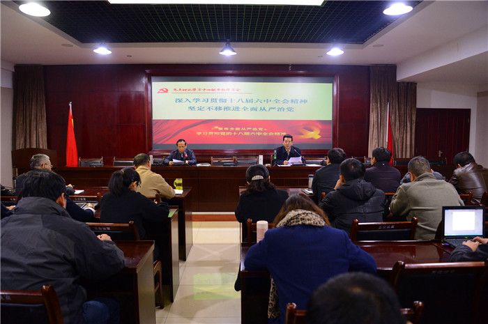 11月11日下午,党委理论学习中心组“深入学习贯彻十八届六中全会精神, 坚定不移推进全面从严治党”专题学习会在行政楼五会议室召开,会议由党委书记马跃荣主持,中心组全体成员、副处级以上领导干部参加学习。