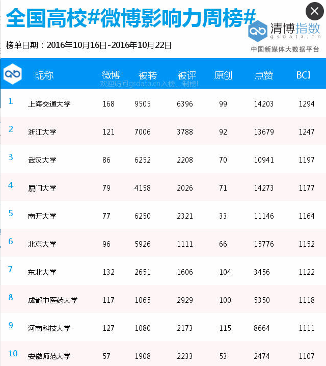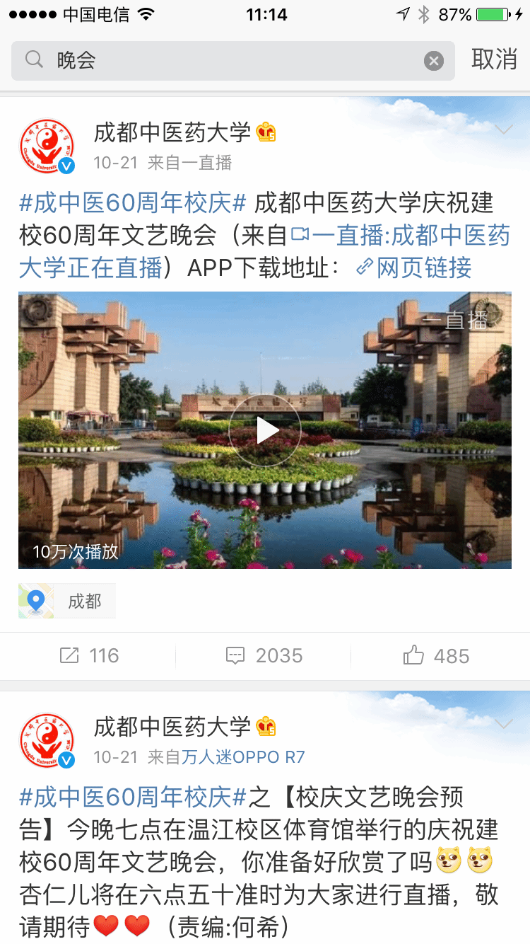 学校官方微博在全国高校微博影响力周榜中位居第八(2016.10.16—2016.10.22) 发布时间:2016-10-26 11:21:00 浏览次数: 次 【字体:小 大】 10月21日晚,学校官方微博直播了庆祝建校60周年文艺晚会,当晚收看直播人数达到10万人次,评论2035条, 转发116条。 (编辑/任翔) 【打印正文】 上一条:学校官方微博在全国高校微博影响力周榜中位居第八(2016.10.16—2016.10.22) 下一条:beat365官网成功承办首届国际中医药肿瘤论坛