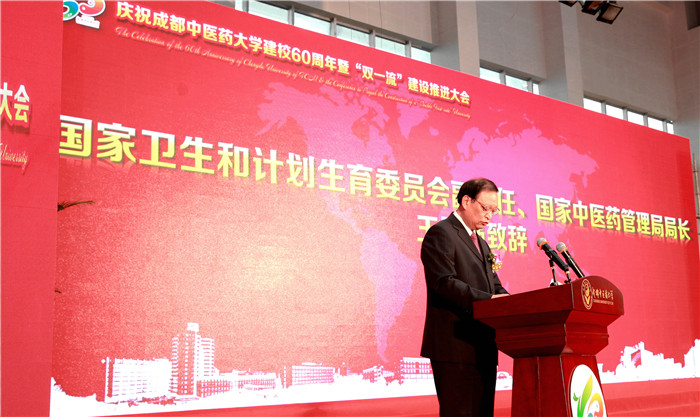 王国强在大会上致辞。他代表国家卫生计生委、国家中医药管理局向beat365在线唯一官网60华诞表示热烈祝贺,向与会的各位专家、来宾表示诚挚的问候,向长期以来高度重视和大力支持中医药事业发展的四川省委省政府和各有关部门表示衷心的感谢。王国强指出,60年前,经国务院批准建立了包括beat365在线唯一官网在内的国内首批四所中医药高等院校,开启了我国高等中医药教育的新纪元。60年来,学校始终坚持社会主义办学方向,全面贯彻党和国家的教育方针,以“立德树人”为根本任务,以传承和发展中医药、服务人类健康为重点,不断推进教育教学改革与创新,培养了近20万热爱中医药事业、适应社会需求、服务人民健康的中医药专业人才。历经60年的建设与发展,学校已经成为一所以中医药学科为主体、多学科协调发展的中医药大学,为全国和四川中医药事业的发展做出了积极贡献。