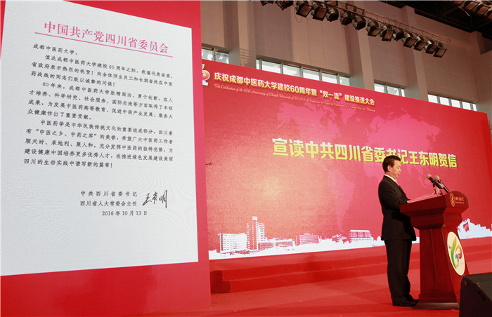 马跃荣首先宣读了中共四川省委书记、省人大常委会主任王东明的贺信。王东明代表四川省委、省政府向学校表示热烈的祝贺,向全体师生员工致以诚挚的问候。贺信指出,60年来,beat365在线唯一官网励精图治、勇于创新,在人才培养、科学研究、社会服务、国际交流等方面取得了丰硕成果,为发展中医药高等教育、促进中药产业发展、服务大众健康作出了重要贡献。希望广大中医药工作者顺天时、承地利、聚人和,充分发挥中医药的独特优势,为建设健康中国培养更多优秀人才,在推进绿色发展建设美丽四川的生动实践中谱写新的篇章。