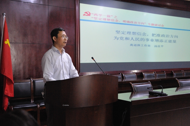 离退休工作处处长汤良平、外语学院党总支书记高旭亮、体育学院党总支书记丁廷孝分别围绕主题作交流发言。