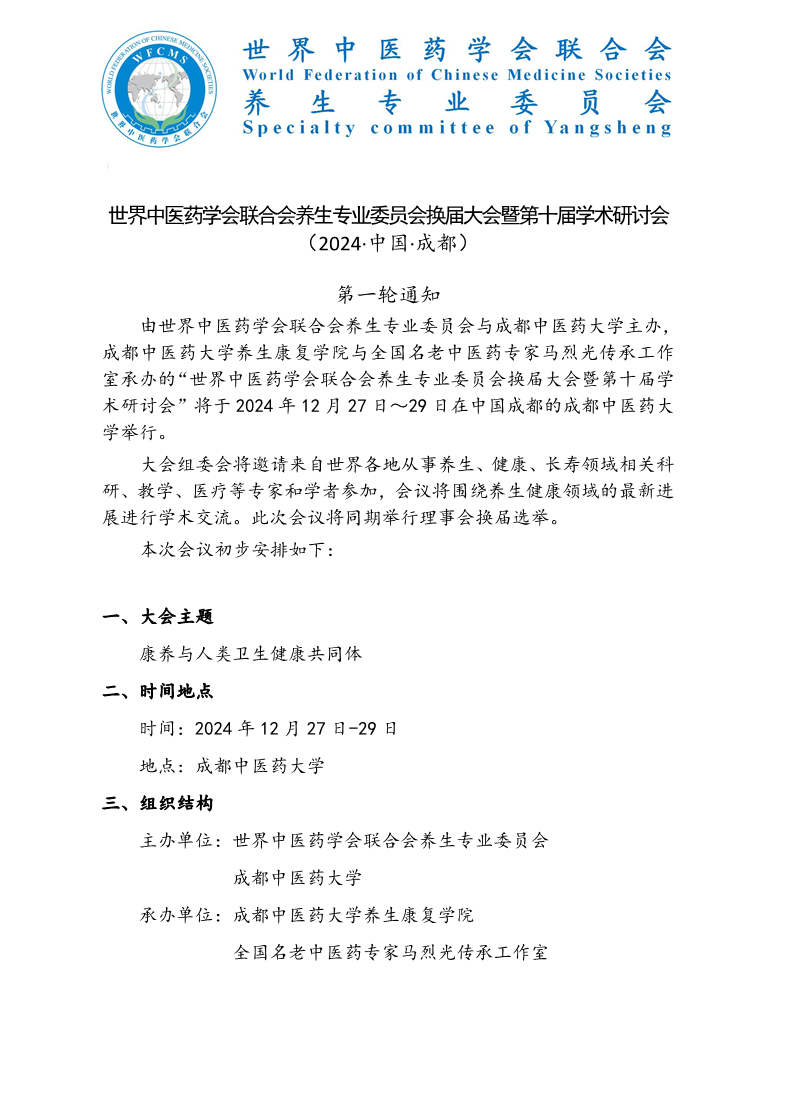 会议预告丨世界中医药学会联合会养生专业委员会换届大会暨第十届学术研讨会 发布时间:2025-06-06 12:07:31 浏览次数: 次 【字体:小 大】 主 题:康养与人类卫生健康共同体时 间:2025年6月6日(星期五)至8日(星期日)地 点:成都费尔顿大酒店三楼大会议室、温江校区弘景五号楼学术报告厅主 办:beat365在线唯一官网 世界中医药学会联合会养生专业委员会承 办:beat365在线唯一官网养生康复学院 中医药养生健康产业发展国家中医药管理局重点研究室 全国名老中医药专家马烈光教授传承工作室 成都中医大国医馆 【打印正文】 上一条:会议预告丨“一带一路”传统医学合作暨中医药现代化国际科技大会 下一条:会议预告丨科研思路与方法培训