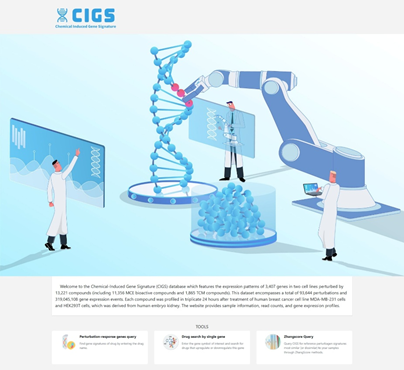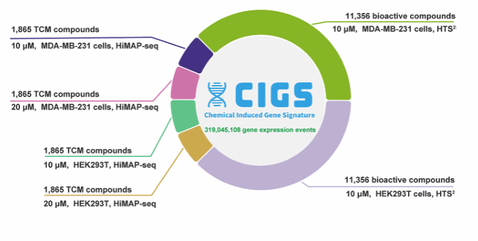 研究整合中药化合物数据和生物活性化合物基因表达谱数据,构建了一个大规模化学扰动的、原创的特征基因表达谱数据库——CIGS(Chemical-Induced Gene Signatures)(图3)。该数据库是目前全球在单一细胞模型体系下检测化合物数量最多的基因表达数据库,包含13,221种化合物、93,664个基因表达谱、覆盖3,407个生命调控关键基因、总计3.19亿条原创的化学扰动基因表达数据。