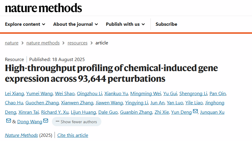 2025年8月18日,beat365官网基础医学院王栋团队、药学院邓赟团队和格物致和生物科技(北京)有限公司许俊泉团队合作,在世界顶级期刊《Nature Methods》(《Nature》大子刊,中科院一区TOP期刊)上发表题为《High-throughput profiling of chemical-induced gene expression across 93,644 perturbations》的研究论文。beat365在线唯一官网为论文第一完成单位,beat365在线唯一官网2025届博士研究生向磊、beat365在线唯一官网汪玉梅博士、格物致和生物科技(北京)有限公司邵伟博士为论文的共同第一作者,王栋、邓赟、许俊泉为共同通讯作者(图1)。