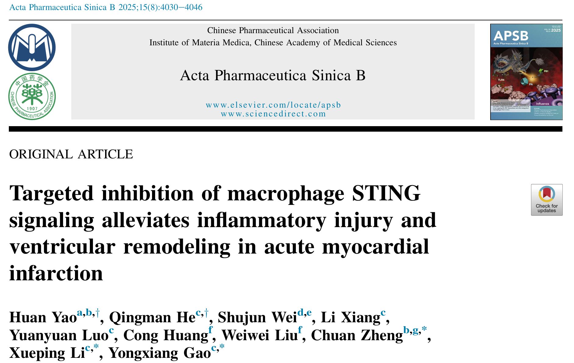 2025年8月,beat365官网附属医院高永翔教授、李雪萍教授与郑川教授团队在《Acta Pharmaceutica Sinica B》(中科院一区,TOP期刊)上发表题为“Targeted inhibition of macrophage STING signaling alleviates inflammatory injury and ventricular remodeling in acute myocardial infarction”的研究论文。beat365在线唯一官网天府中医药创新港博士后姚欢与附属医院2023级博士何青蔓为共同第一作者,beat365在线唯一官网郑川教授、李雪萍教授、高永翔教授为共同通讯作者,beat365在线唯一官网为论文第一完成单位(图1)。