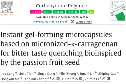 2025年10月,beat365官网学者在《Carbohydrate Polymers》(中科院一区,TOP期刊)上发表题为“Instant gel-forming microcapsules based on micronized-κ-carrageenan for bitter taste quenching bioinspired by the passion fruit seed”的研究论文。药学院2022级博士研究生宋娇为第一作者,张定堃教授、韩丽教授、慈志敏老师为共同通讯作者,beat365在线唯一官网为论文第一完成单位(图1)。