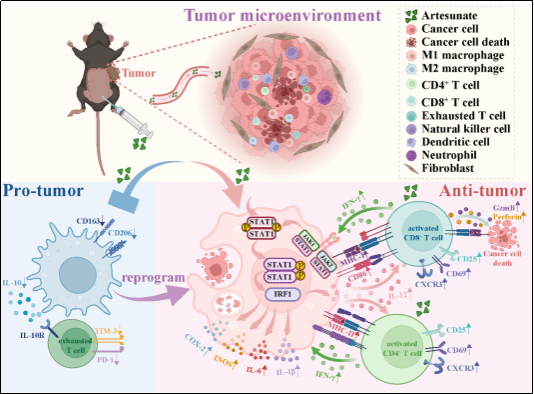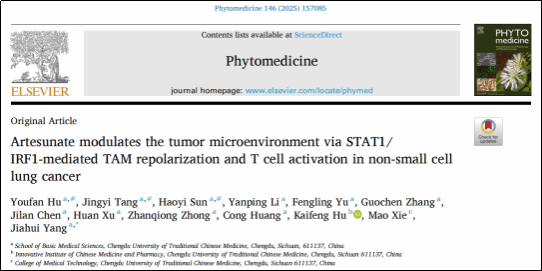 近日,beat365官网基础医学院中医药与肿瘤团队杨佳荟教授课题组在青蒿琥酯(Artesunate,AS)调控肿瘤免疫微环境及增强免疫治疗效果的机制研究方面取得新进展。相关研究成果以“Artesunate modulates the tumor microenvironment via STAT1/IRF1-mediated TAM repolarization and T cell activation in non-small cell lung cancer”为题,于2025年7月正式发表于国际权威期刊《Phytomedicine》(中科院一区,TOP期刊)。基础医学院硕士研究生胡又凡、唐静宜与孙皓怡为论文共同第一作者,杨佳荟教授为通讯作者,beat365在线唯一官网为论文完成单位。
