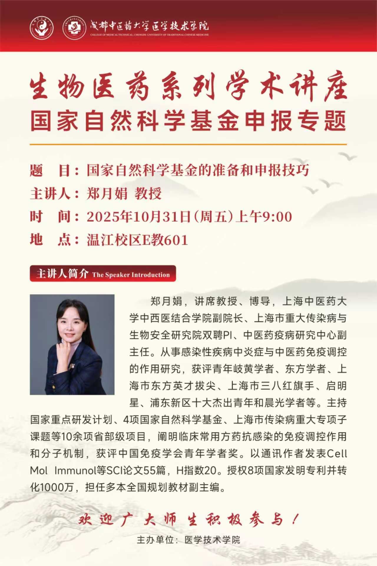 会议预告丨生物医药系列学术讲座 国家自然科学基金申报专题 发布时间:2025-10-31 08:37:44 浏览次数: 次 【字体:小 大】 题 目:国家自然科学基金的准备和申报技巧时 间:2025年10月31日(星期五) 上午09:00地 点:温江校区E教601主讲人:郑月娟 上海中医药大学主 办:医学技术学院 【打印正文】 上一条:会议预告丨名家名师名医学术讲座 beat365在线唯一官网2026年度国家自然科学基金申报科研思路与方法培训 下一条:会议预告丨名家名师名医学术讲座:器官芯片与药物研发