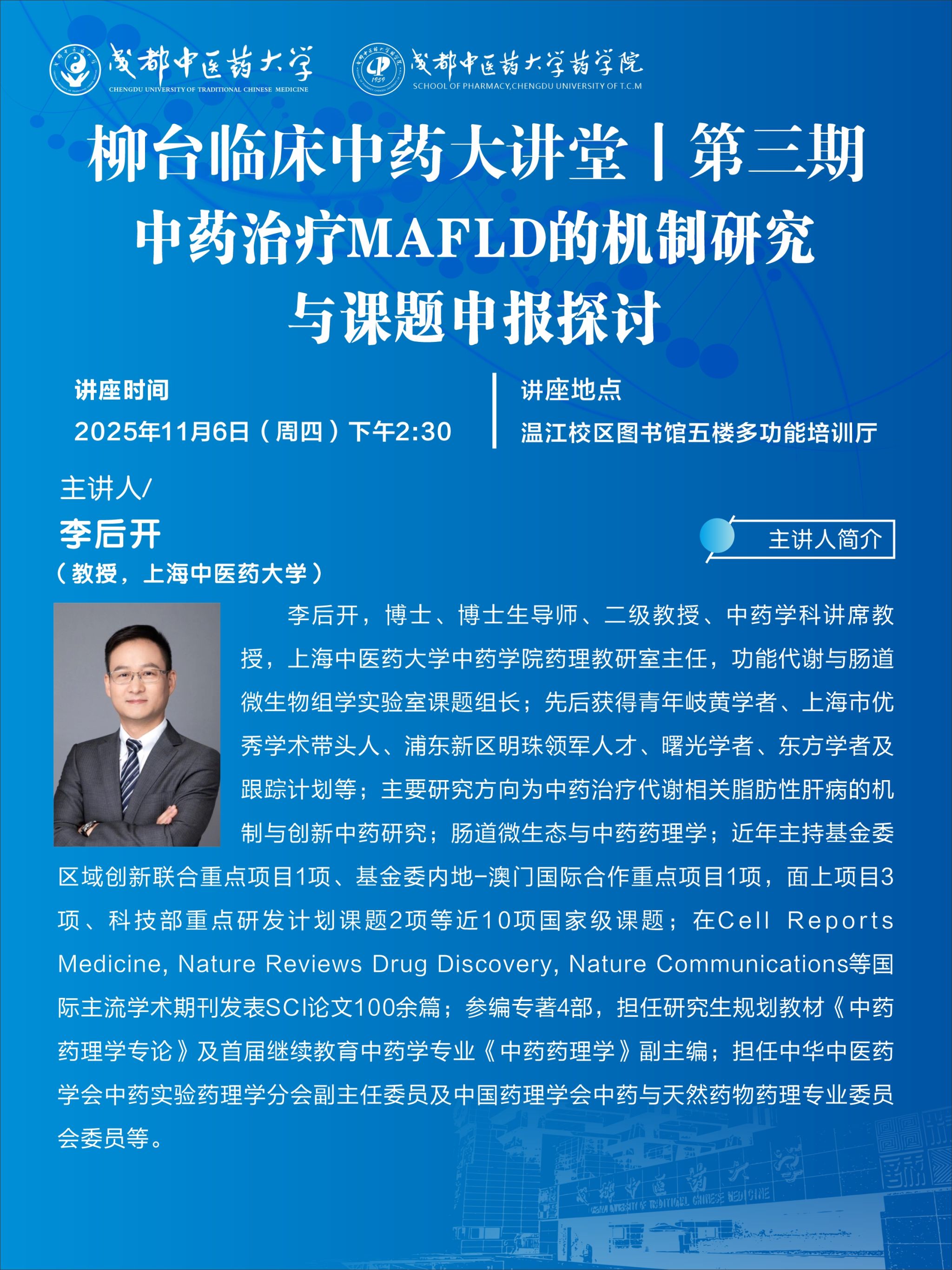 会议预告丨柳台临床中药大讲堂第三期 发布时间:2025-11-05 11:11:07 浏览次数: 次 【字体:小 大】 题 目:中药治疗MAFLD的机制研究与课题申报探讨时 间:2025年11月6日(星期四) 下午14:30地 点:温江校区图书馆五楼多功能培训厅主讲人:李后开 上海中医药大学主 办:beat365在线唯一官网 beat365在线唯一官网药学院 【打印正文】 上一条:学术成果丨beat365官网学者在植物磷利用研究中取得系列进展 下一条:会议预告丨名家名师名医学术讲座 beat365在线唯一官网2026年度国家自然科学基金申报科研思路与方法培训