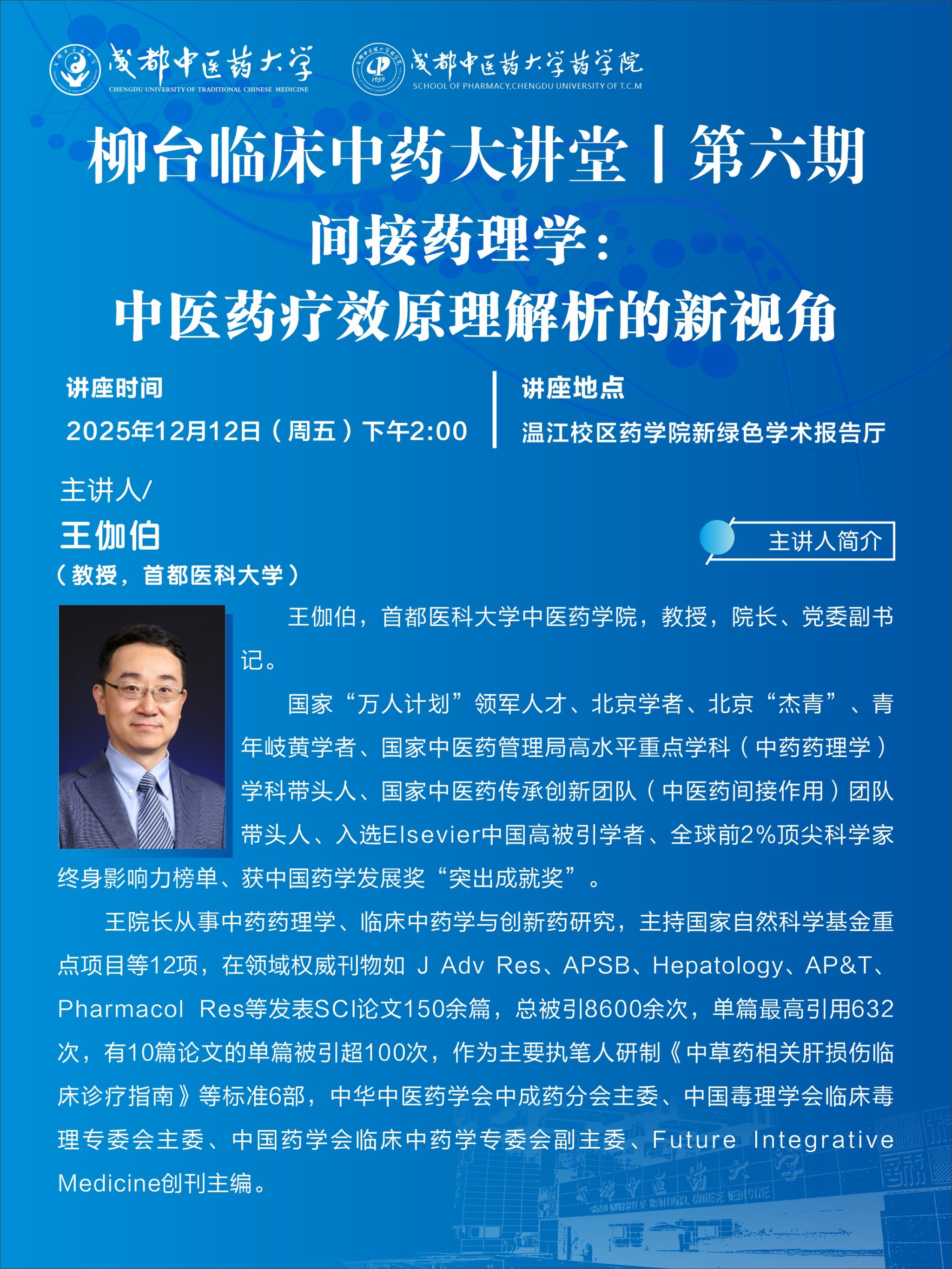 会议预告丨柳台临床中药大讲堂第六期 发布时间:2025-12-12 10:25:48 浏览次数: 次 【字体:小 大】 题 目:间接药理学:中医药疗效原理解析的新视角时 间:2025年12月12日(星期五) 下午14:00地 点:温江校区药学院新绿色学术报告厅主讲人:王伽伯 首都医科大学主 办:beat365在线唯一官网 beat365在线唯一官网药学院 【打印正文】 上一条:学术成果丨beat365官网学者在川芎水稻轮作内在机制解析系列研究中取得新进展 下一条:会议预告丨药苑讲座