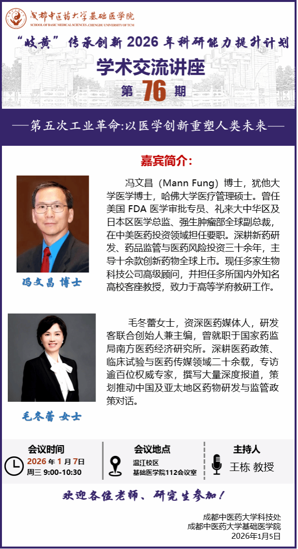 会议预告丨“岐黄”传承创新2026年科研能力提升计划学术交流讲座第76期 发布时间:2026-01-05 11:12:13 浏览次数: 次 【字体:小 大】 题 目:第五次工业革命:以医学创新重塑人类未来时 间:2026年1月7日 (星期三) 9:00地 点:温江校区基础医学院112会议室主讲人:冯文昌 美国 Macafex 咨询公司 毛冬蕾 上海汐潮信息技术有限公司主 办:科技处 基础医学院 【打印正文】 上一条:会议预告丨“致知·融智”生物医药系列学术讲座 国家自然科学基金申报专题第八期 下一条:学术成果丨beat365官网学者在川芎水稻轮作内在机制解析系列研究中取得新进展