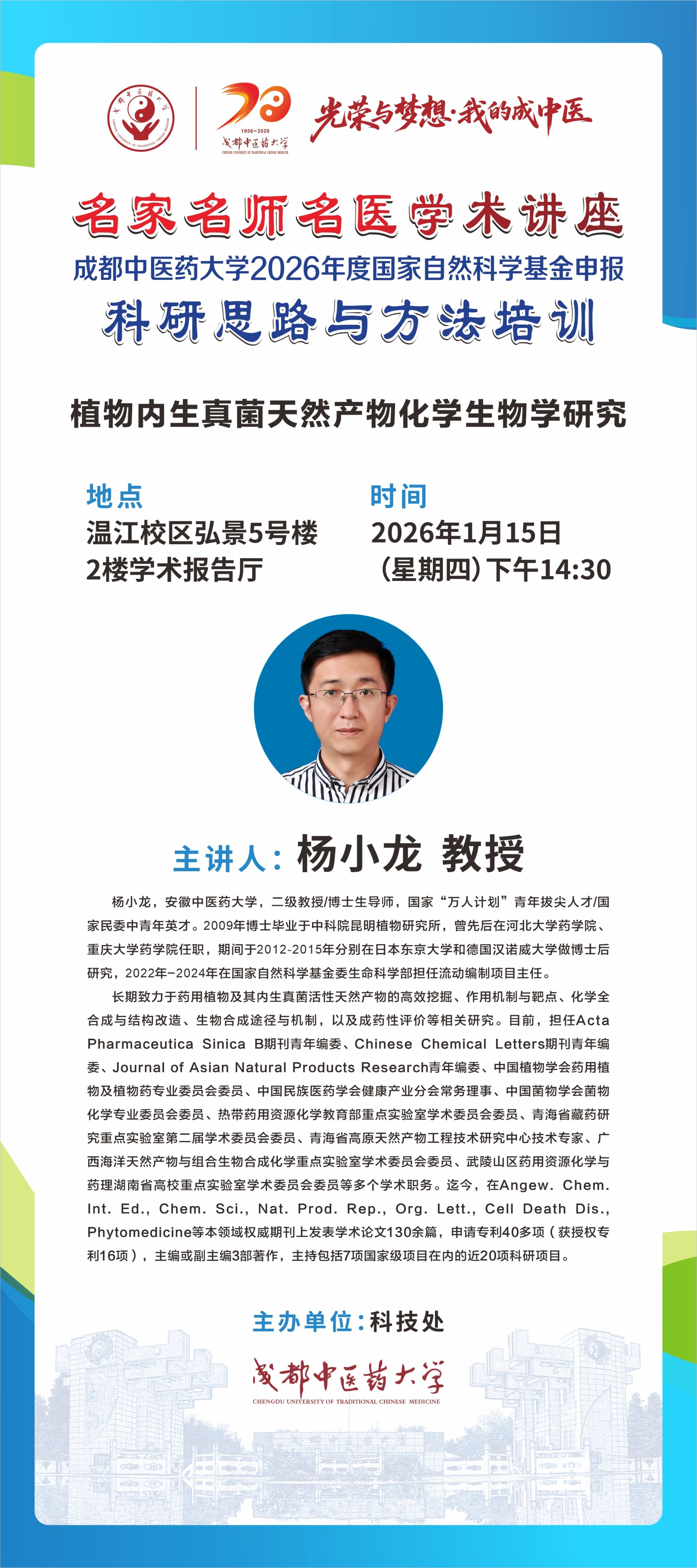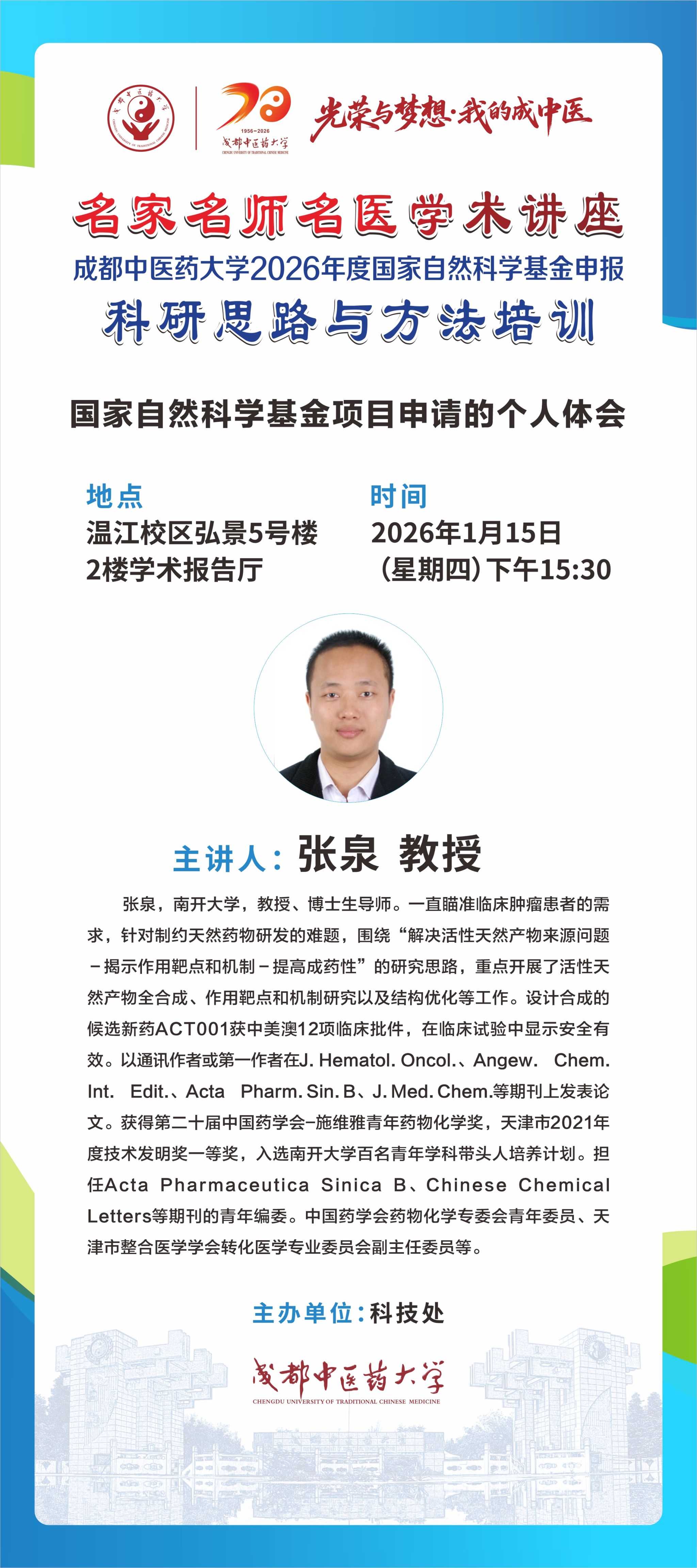 会议预告丨名家名师名医学术讲座 beat365在线唯一官网2026年度国家自然科学基金申报科研思路与方法培训 发布时间:2026-01-12 10:54:12 浏览次数: 次 【字体:小 大】 题 目 1:植物内生真菌天然产物化学生物学研究时 间:2026年1月15日(星期四) 下午14:30主讲人:杨小龙 安徽中医药大学题目 2:国家自然科学基金项目申请的个人体会时 间:2026年1月15日(星期四) 下午15:30主讲人:张 泉 南开大学 地 点:温江校区弘景5号楼2楼学术报告厅主 办:科技处 【打印正文】 上一条:会议预告丨名家名师名医学术讲座 beat365在线唯一官网2026年度国家社会科学基金申报科研思路与方法培训 下一条:学术成果丨beat365官网学者在《Drug Resistance Updates》发表光热微凝胶递药体系促进耐药菌感染伤口愈合的研究成果