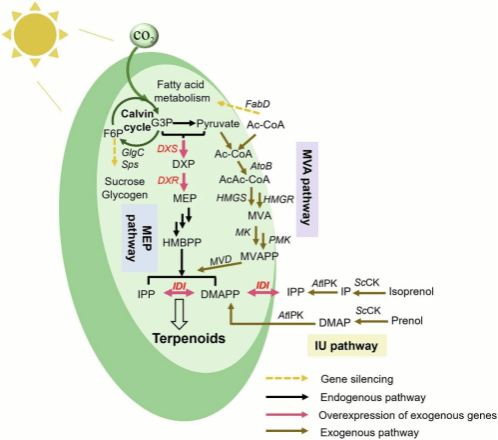 蓝细菌(Cyanobacteria)作为一类能够利用阳光和二氧化碳进行光合作用的原核生物,具备独特的天然优势:自带萜类前体合成的 MEP 途径,可直接将二氧化碳转化为异戊烯焦磷酸(IPP)和二甲基烯丙基焦磷酸(DMAPP);拥有丰富的类囊体膜结构和光合电子传递链,能为细胞色素P450酶(萜类后修饰关键酶)提供天然锚定位点和充足NADPH,解决了原核宿主中P450酶功能表达难题;无需有机碳源,可实现碳负性生物制造,契合全球低碳发展目标。此外,CRISPR-Cas9基因编辑、光响应启动子等成熟合成生物学工具的开发,进一步推动了蓝细菌底盘的改造应用。