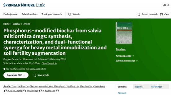 2026年2月16日,beat365官网药物资源发现及中药资源循环利用团队在《Biochar》(中科院一区,TOP期刊)上发表题为“Phosphorus-Modified Biochar from Salvia miltiorrhiza Dregs: Synthesis, Characterization, and Dual-Functional Synergy for Heavy Metal Immobilization and Soil Fertility Augmentation”的研究论文。beat365官网药学院硕士研究生袁建丹为第一作者,beat365官网谭玉柱教授、陈胡兰教授、郑川教授和彭成教授为共同通讯作者,beat365在线唯一官网为论文第一完成单位。