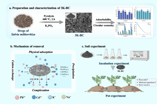 本研究凸显了3K-BC的三大亮点:(1)废物资源化:直接利用丹参药渣,原料零成本;(2)修复-增产协同:重金属固定与作物增产同步实现;(3)转化效率高:50天内土壤中铅和镉的残渣态转化率最高达15%和25%。目前团队已在川芎种植中验证其效果,未来将拓展至更多作物体系,推动田间规模化应用。该成果是落实国务院《关于提升中药质量促进中医药产业高质量发展的意见》及八部门《中药工业高质量发展实施方案(2026—2030年)》中“加强中药资源循环利用关键技术攻关”的具体实践,为中药渣高值化利用与土壤重金属污染治理提供了一条“修复-增产-提质”三效合一的可行路径。