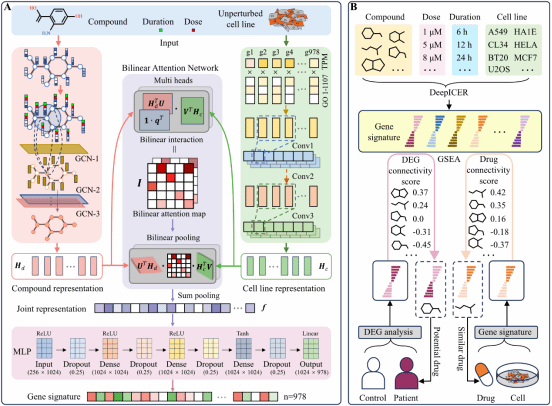 针对上述难题,研究团队创新性构建了DeepICER模型,该模型整合化合物结构、剂量、扰动时长及细胞系类型等因素,采用四模块协同架构实现了基因表达谱预测。化合物编码模块将剂量与扰动时长信息嵌入分子图原子节点特征,通过图卷积网络学习协同表征;细胞系编码模块结合基因本体注释与表达值构建融合矩阵,经一维卷积网络提取特异性细胞系特征;双线性注意力网络模块精准捕捉化合物与细胞系特征间的复杂相互作用,同时提升模型可解释性;预测模块通过全连接网络高效输出标志性基因表达谱。基于 CMap 核心假设,团队还为 DeepICER 构建了“预测–评分–筛选”的完整应用流程,实现了候选化合物的快速筛选与评估。
