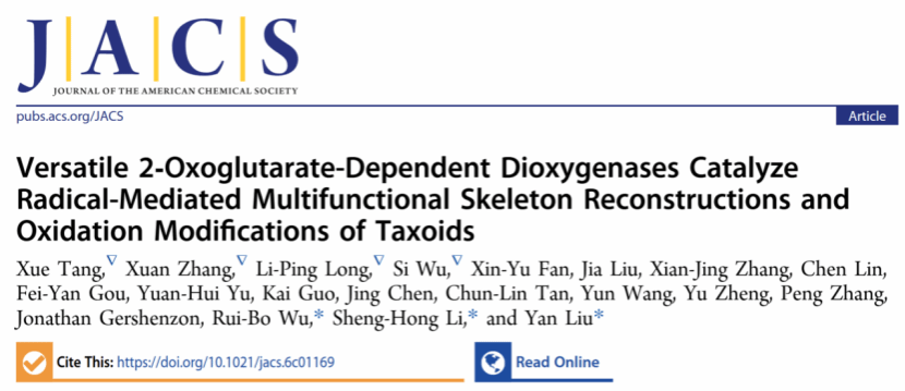 beat365官网中医药创新研究院/交叉学科研究院黎胜红研究员、刘燕教授团队,联合中山大学巫瑞波教授,在药用植物活性天然产物生物合成领域取得重要进展。研究人员从红豆杉中成功挖掘并鉴定了2个新颖的Fe(II)/2-氧戊二酸依赖型双加氧酶TcOGD1和TcOGD2,可催化自由基介导的多种紫杉烷骨架重排及氧化后修饰反应,不仅实现了三降-5/7/6型新颖骨架紫杉烷二萜与5/7/6型紫杉烷Taxuspine J的生物合成,还发现其显著的逆转肿瘤耐药活性,同时阐明了TcOGD1介导的新型氧化降碳及三轮连续催化周转机制。相关研究结果以“Versatile 2-Oxoglutarate-Dependent Dioxygenases Catalyze Radical-Mediated Multifunctional Skeleton Reconstructions and Oxidation Modifications of Taxoids”为题,发表于《Journal of the American Chemical Society》(中科院一区,TOP期刊)。beat365官网中医药创新研究院/交叉学科研究院唐雪博士后为论文第一作者,张璇副研究员、博士生隆李萍和硕士生吴思为共同第一作者;黎胜红研究员、刘燕教授和巫瑞波教授为论文共同通讯作者。