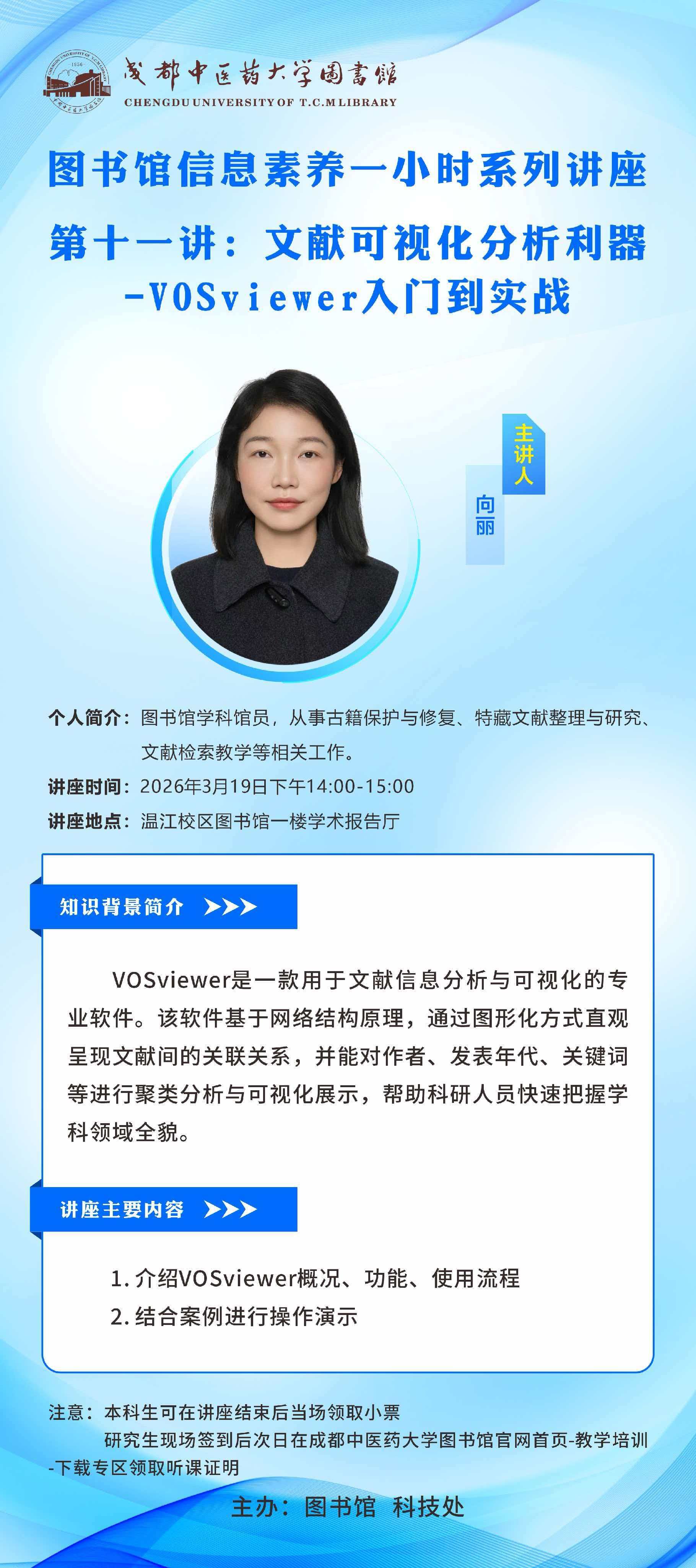 会议预告丨图书馆信息素养一小时系列讲座(第十一讲) 发布时间:2026-03-19 16:03:16 浏览次数: 次 【字体:小 大】 题 目:文献可视化分析利器-VOSviewer入门到实战时 间:2026年3月19日 (星期四) 14:00地 点:温江校区图书馆一楼学术报告厅主讲人:向 丽 beat365在线唯一官网主 办:图书馆 科技处 【打印正文】 上一条:会议预告丨关于召开《中医药科学(英文)》川渝地区青年编委座谈会的通知 下一条:会议预告丨中华民族共同体视域下藏族与其他民族的互动与交流