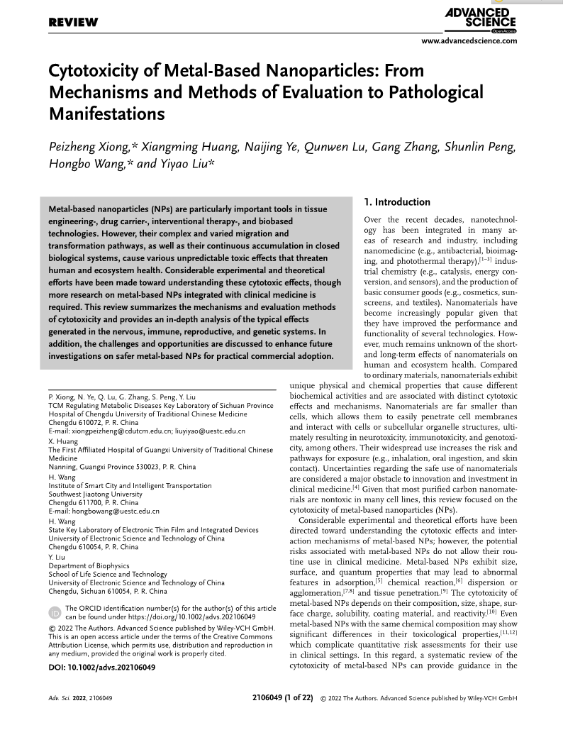 金属基纳米颗粒由于其优异的物理和化学性质,在生物和医学领域中的应用越来越广泛。然而,它们的广泛应用也增加了生物个体的暴露风险和潜在的生物学毒性。近期,beat365在线唯一官网附属医院·代谢性疾病中医药调控四川省重点实验室刘贻尧教授团队在国际知名期刊《Advanced Science》(中科院JCR一区Top期刊)上发表了题为《Cytotoxicity of metal-based nanoparticles: from mechanisms and methods of evaluation to pathological manifestations》的论文,系统地从机制、评价方法和病理表现方面总结了金属基纳米材料毒理学的最新研究进展。