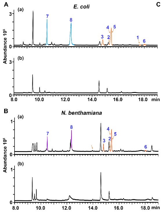 萜类化合物是植物中种类最多、化学结构变化最为丰富的一类天然产物,在植物生长发育、适应环境胁迫等方面发挥着重要作用,并具有重要药用和经济价值。二倍半萜是一类稀有的萜类天然产物,结构新颖复杂、生物活性广泛,大多存在于海洋生物中,目前对于二倍半萜在植物中的分布规律、生物功能与生物合成知之甚少。黎胜红研究团队多年来致力于特色药用植物中萜类天然产物的化学多样性、生物功能和生物合成研究。近期该团队从唇形科药用植物米团花中鉴定了一个双功能的二倍半萜/二萜合酶,能够催化生成6个大环二倍半萜和2个大环二萜产物,其中5个为新化合物,包括2个首次发现的具有18元环的二倍半萜,也是迄今为止发现的具有最大碳环结构的萜类天然产物。通过分子对接结合定点突变获得了2个二倍半萜产量显著提高的突变酶,并发现大环二倍半萜的免疫抑制活性。