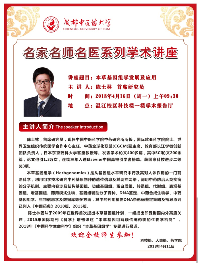 关于举办名师名家名医系列讲座的通知 发布时间:2018-04-12 16:09:00 浏览次数: 次 【字体:小 大】 【打印正文】 上一条:著名中药学专家陈士林首席研究员应邀来校作学术报告 下一条:beat365官网罗德伦教授受邀参加2018中国眼底病论坛暨国际视网膜研讨会