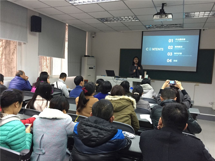 作为现代教学方法之一——“微课”的设计与制作吸引了在座师生们的极大兴趣。邹帆老师从“微课”一词的来源引出微课的概念,并采用具有代表性的微课视频作为实例,对微课的特征、组成要素和类型进行了介绍和归纳。随后,她对微课的制作方法和步骤进行介绍,从视频、图片等素材的搜集到素材整合常用软件的使用,再到具体的软件操作步骤分解展示,以及最后效果的演示,邹帆老师生动活泼的语言表达让师生们印象深刻,也让大家对微课的内容和制作流程有了初步的了解。邹帆积极鼓励大家尝试制作微课,更强调成功的微课要以优秀的教学内容和设计为核心。
