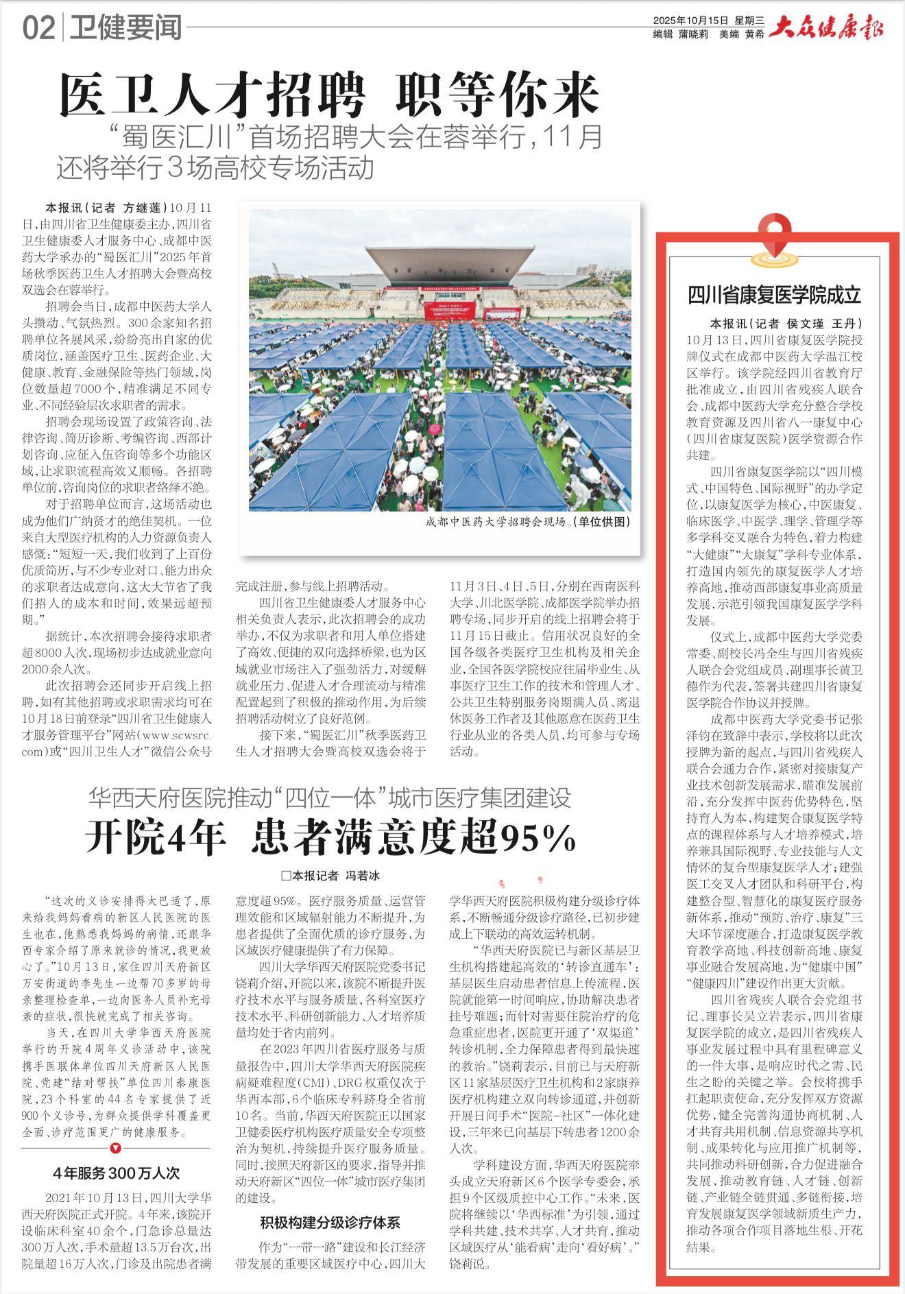 【大众健康报】四川省康复医学院成立 发布时间:2025-10-15 10:04:34 浏览次数: 次 【字体:小 大】 【打印正文】 上一条:【大众健康报 今日头条】四川省康复医学院成立 下一条:【金温江】beat365在线唯一官网2026届毕业生秋季双选会举行