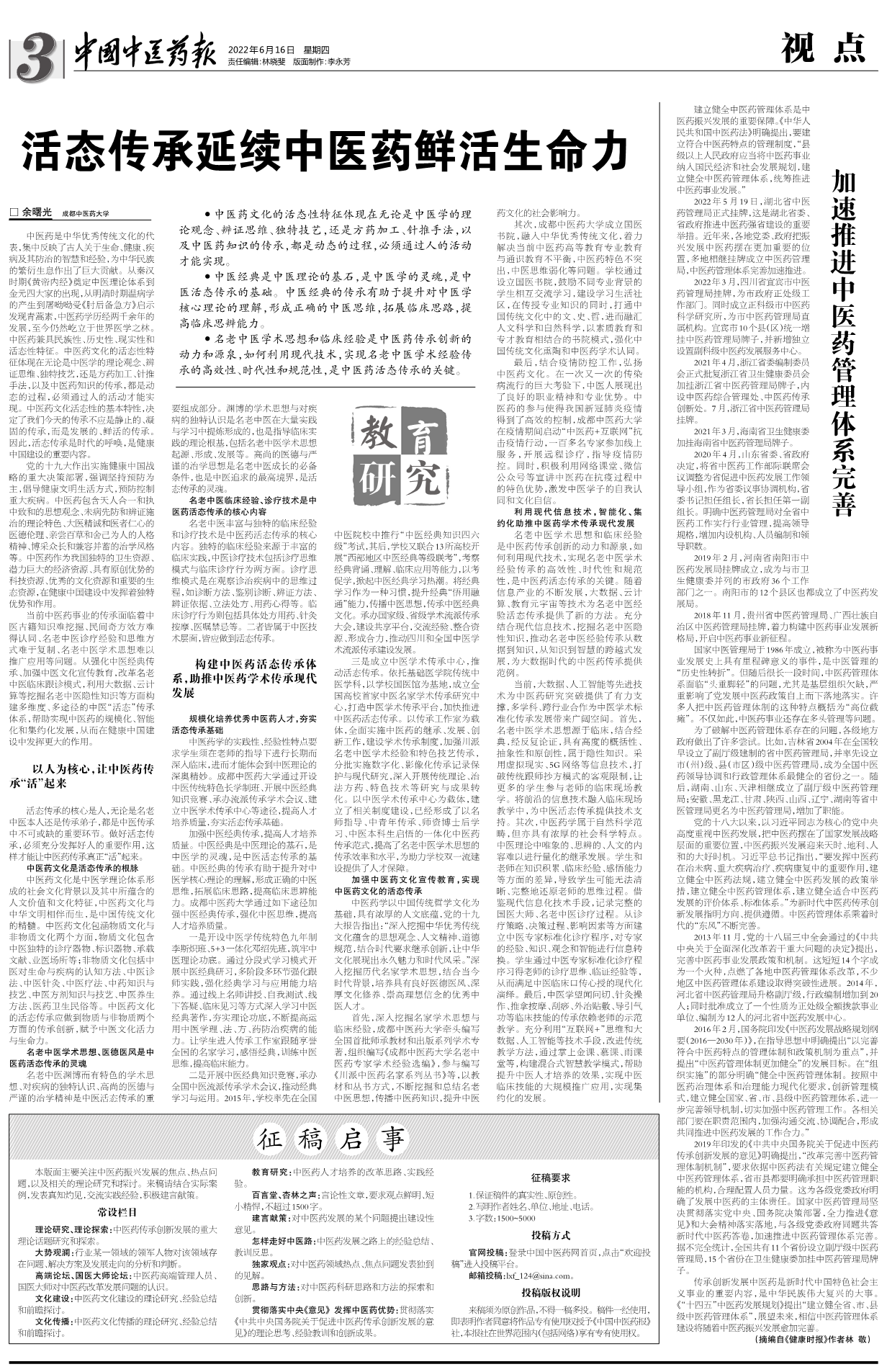 2022年6月16日,《中国中医药报》第3版刊登beat365在线唯一官网校长余曙光署名文章《活态传承延续中医药鲜活生命力》,以下为报道全文: