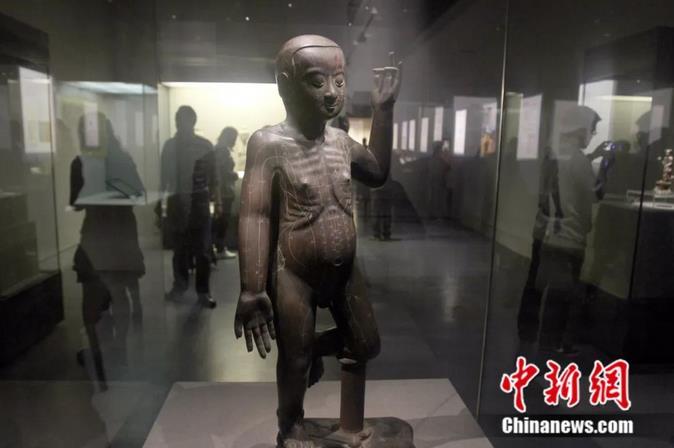 明代“腧穴针炙铜人立像”。该文物高86.5厘米,全身铸有15条经络和354个穴位名称,穴位的定位与明中期的医学文献一致。中新社记者 张畅 摄