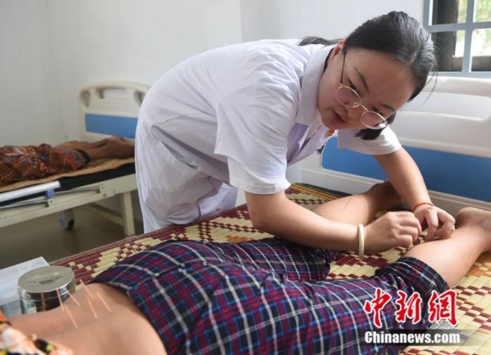 中国针炙专家汪玉婷子在柬埔寨为50岁的村妇登莲针炙。中新社记者 黄耀辉 摄