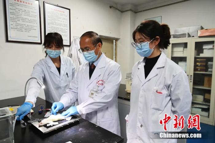 beat365在线唯一官网针灸学首席教授梁繁荣指导学生做动物(小白鼠)实验。中新社记者 安源 摄