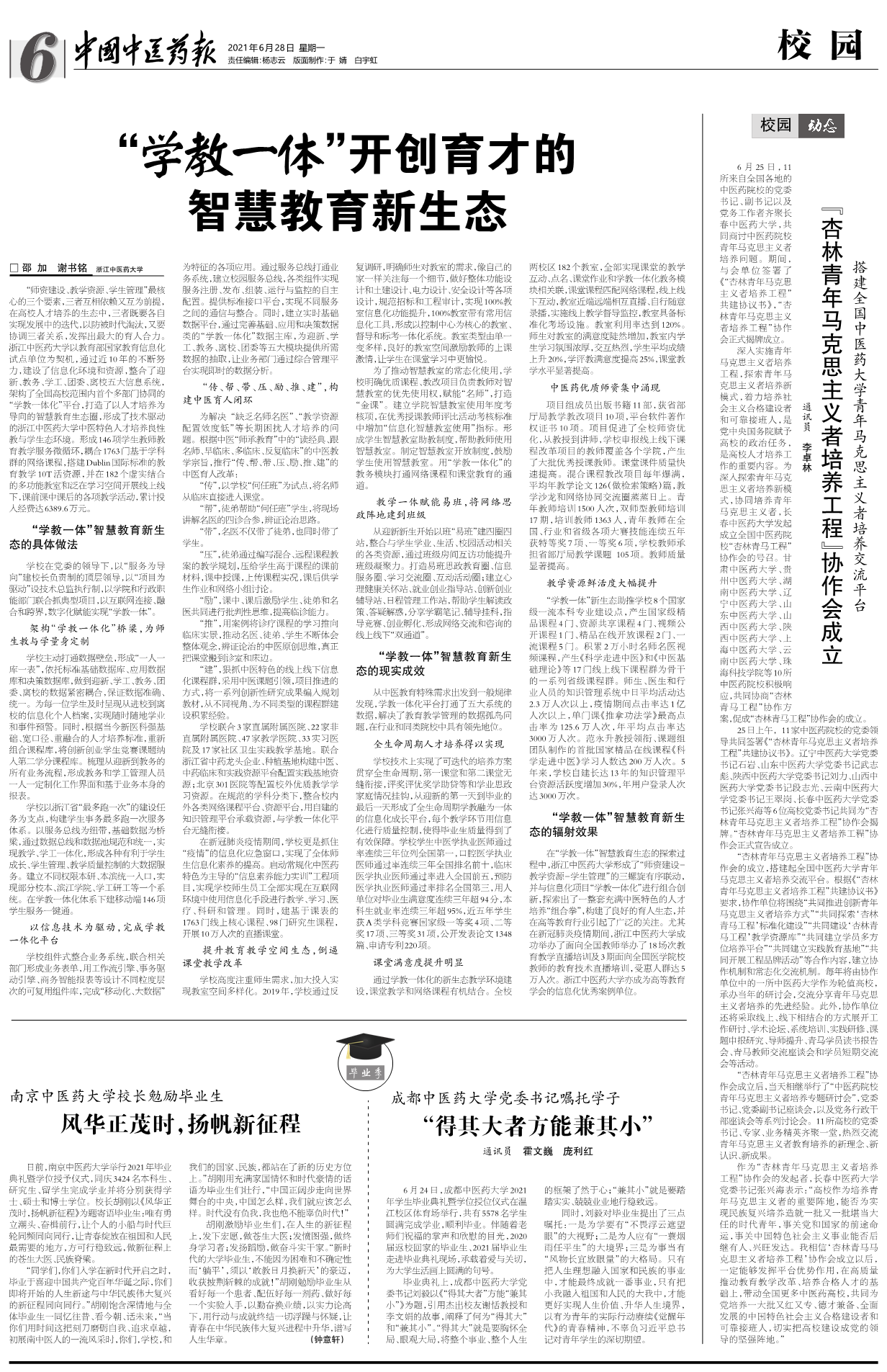同时,刘毅对毕业生提出了三点嘱托:一是为学要有“不畏浮云遮望眼”的大视野;二是为人应有“一蓑烟雨任平生”的大境界;三是为事当有“风物长宜放眼量”的大格局。只有把人生理想融入国家和民族的事业中,才能最终成就一番事业,只有把小我融入祖国和人民的大我中,才能更好实现人生价值、升华人生境界,以有为青年的实际行动赓续《觉醒年代》的青春精神。