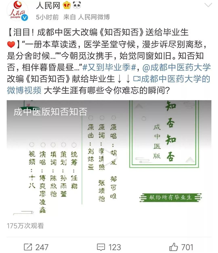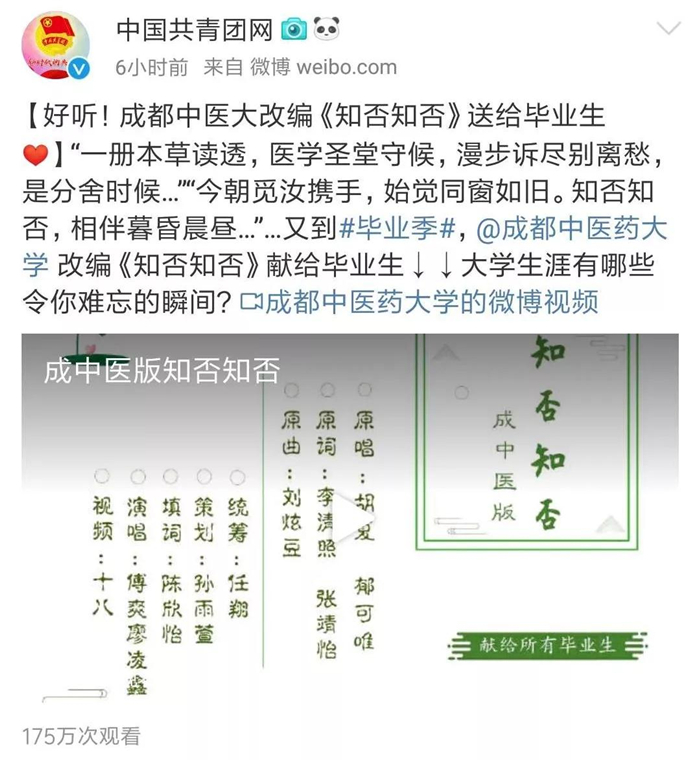 又到毕业离别时,学校里充满了浓浓的离别之情,老师、同窗、室友,以及校园里的花花草草都成了大家依依不舍的眷恋。近日,一首由beat365在线唯一官网学生改编,送给毕业同学的《知否知否》就走红网络,被人民日报、中国共青团网等多家官方微博转发。该视频在短短6个小时中就吸引了170多万人次的观看量。