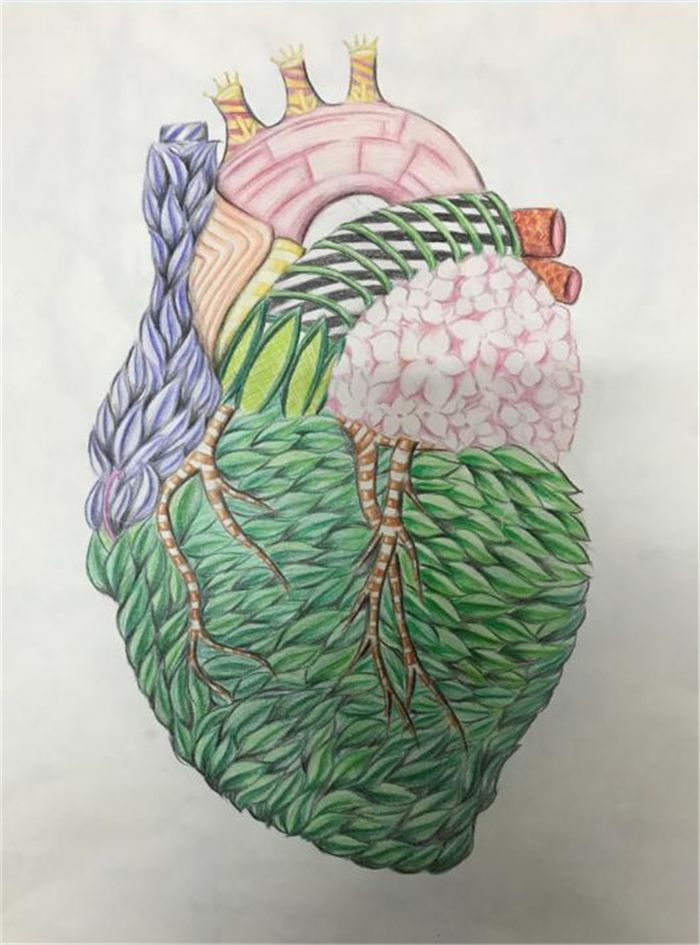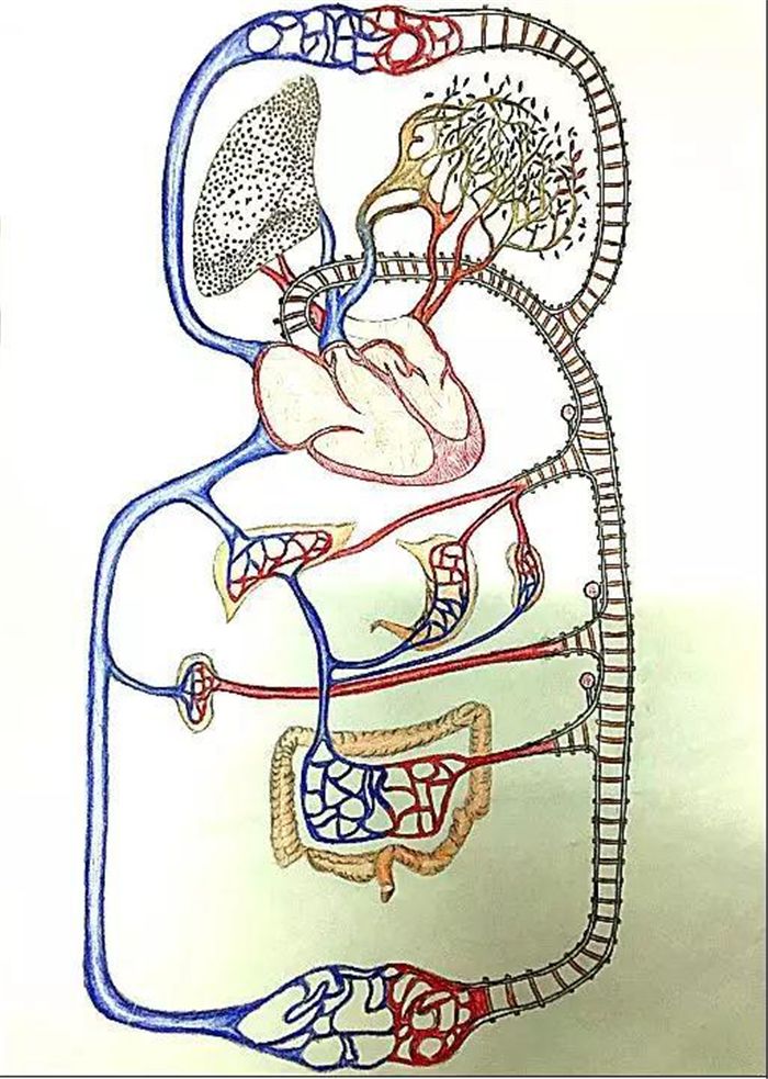 杨可欣的作品《循环之轨》在比赛中获得了一等奖,她说,“由于本身的专业,我们对于人体解剖更加了解。我在绘画时一边写实,一边想象。左边是人体正常的血液循环轨道,右边是火车轨道,心脏是整个循环的核心,供给着整个身体所需的营养物质和氧气等,就像一个能量站一样,连接着的血管将血液运送到身体各处就像火车轨道一样,连接着世界各地也汇集着世界各地。”