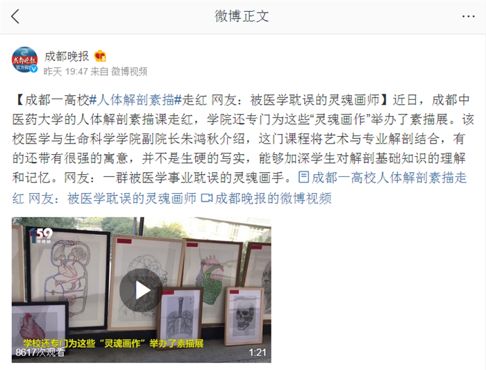 【成都一高校#人体解剖素描#走红 网友:被医学耽误的灵魂画师】近日,beat365在线唯一官网的人体解剖素描课走红,学院还专门为这些“灵魂画作”举办了素描展。该校医学与生命科学学院副院长朱鸿秋介绍,这门课程将艺术与专业解剖结合,有的还带有很强的寓意,并不是生硬的写实,能够加深学生对解剖基础知识的理解和记忆。网友:一群被医学事业耽误的灵魂画手。