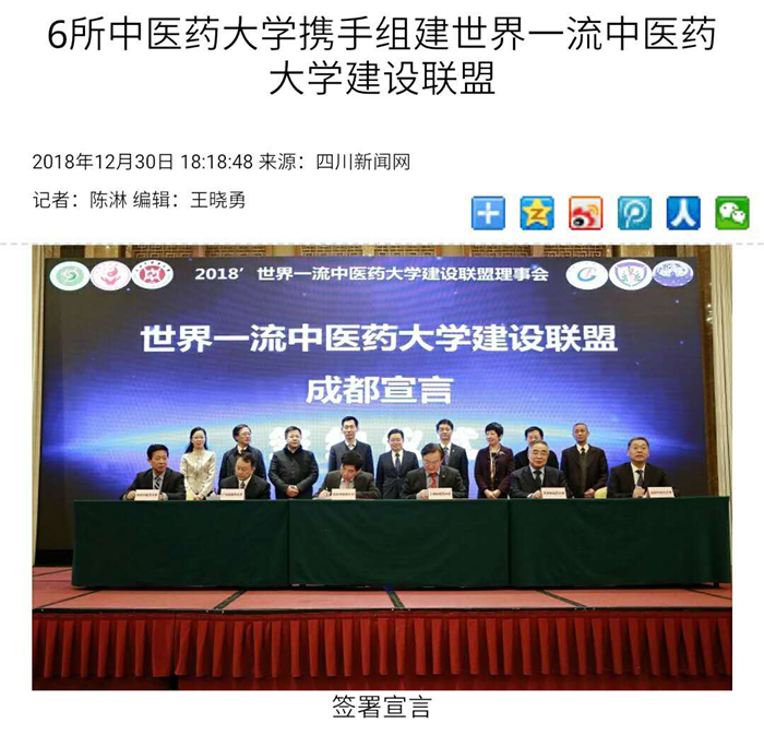 12月30日,2018世界一流中医药大学建设联盟理事会会议在成都召开。会上,来自北京中医药大学、上海中医药大学、广州中医药大学、南京中医药大学、天津中医药大学以及beat365在线唯一官网在成都组建世界一流中医药大学建设联盟,共同探索符合中医药特色和规律的一流大学与一流学科建设之路,为健康中国、文化强国建设贡献中医药力量。