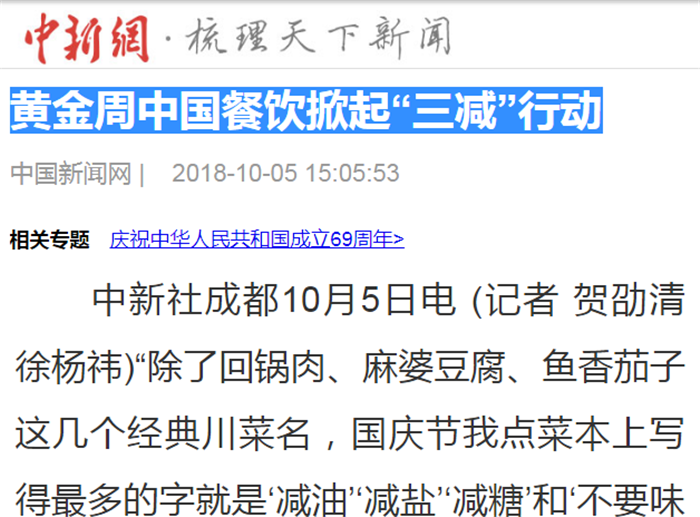 “除了回锅肉、麻婆豆腐、鱼香茄子这几个经典川菜名,国庆节我点菜本上写得最多的字就是‘减油’‘减盐’‘减糖’和‘不要味精’。”国庆长假期间,杜秋菊开在成都杜甫草堂外的川菜店迎来了一年中生意最好的时间。每当顾客下单并要求清淡饮食后,她都会走进热火朝天的后厨,不厌其烦地叮嘱厨师。