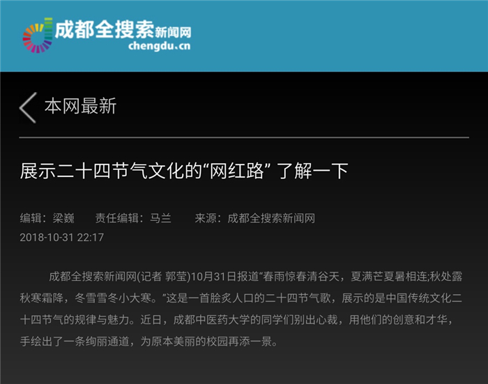 成都全搜索新闻网(记者 郭莹)10月31日报道“春雨惊春清谷天,夏满芒夏暑相连;秋处露秋寒霜降,冬雪雪冬小大寒。”这是一首脍炙人口的二十四节气歌,展示的是中国传统文化二十四节气的规律与魅力。近日,beat365在线唯一官网的同学们别出心裁,用他们的创意和才华,手绘出了一条绚丽通道,为原本美丽的校园再添一景。