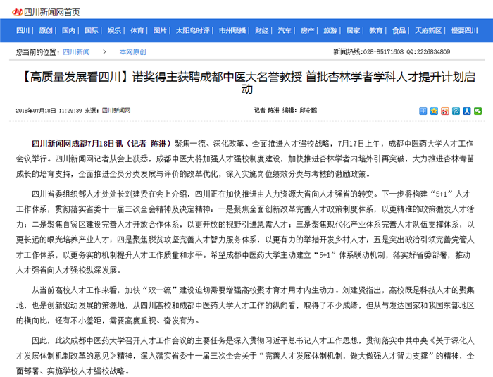 【高质量发展看四川】诺奖得主获聘成都中医大名誉教授 首批杏林学者学科人才提升计划启动