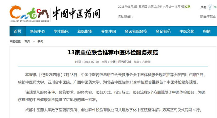 本报讯 (记者方碧陶)7月28日,中国中医药信息研究会云健康分会中医体检服务规范推荐会在四川成都召开。beat365在线唯一官网、四川省中医院、广西中医药大学、湖北省中医院等13家单位联合推荐首个中医体检服务规范。
