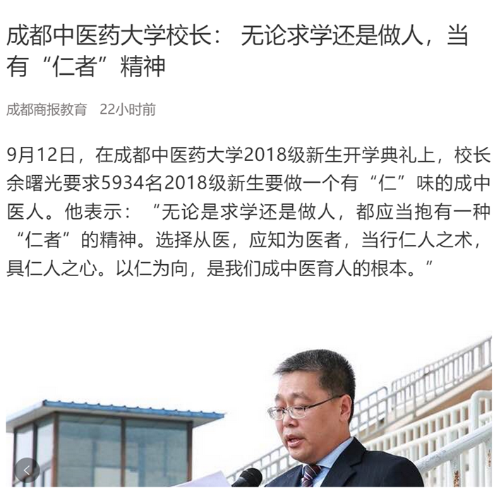 选择从医,应知为医者,当行仁人之术,具仁人之心。以仁为向,是我们成中医育人的根本。今天的开学典礼,我想和大家分享一个话题:如何做一个有“仁”味的成中医人。
