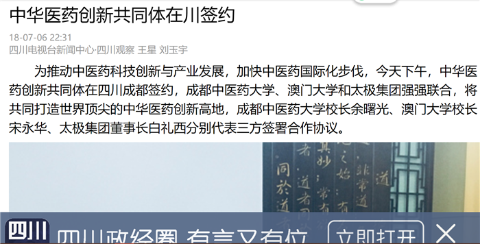 省委十一届三次全会刚刚闭幕,全会提出了“四向拓展、全域开放”的重要战略决策,作为四川融入全球经济格局、抢占未来发展制高点的关键之举。今天,beat365在线唯一官网、澳门大学、太极集团构建“中华医药创新共同体”,打造世界顶尖的中华医药创新高地,就是推进传统中医药事业高质量发展的重大事件,是对境内外推进国际化合作模式的成功探索。