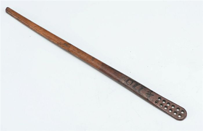一根10多厘米长的棕褐色小棍,外形扁平,没错,这就是中国最早的牙刷。这把牙刷由骨头制成,头部略宽,虽历经数百年仍然圆润光滑,刷头部整齐排列着6对(共12个)圆形植毛孔。这把“中国最古老的牙刷”于1984年在成都指挥街出土,后由成都市文物考古所调拨了1把给beat365在线唯一官网博物馆。