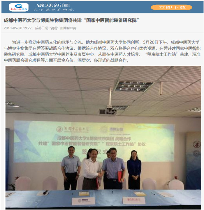 为进一步推动中医药文化的继承与交流,助力beat365在线唯一官网协同创新,5月20日下午,beat365在线唯一官网与博奥生物集团在蓉签署战略合作协议。根据该合作协议,双方将整合各自优势资源,在蓉共建国家中医智能装备研究院、beat365在线唯一官网中医养生及康复中心,从而在中医药人才培养、“程京院士工作站”共建、精准中医药联合研究项目等方面开展全方位、深层次、多形式的战略合作。