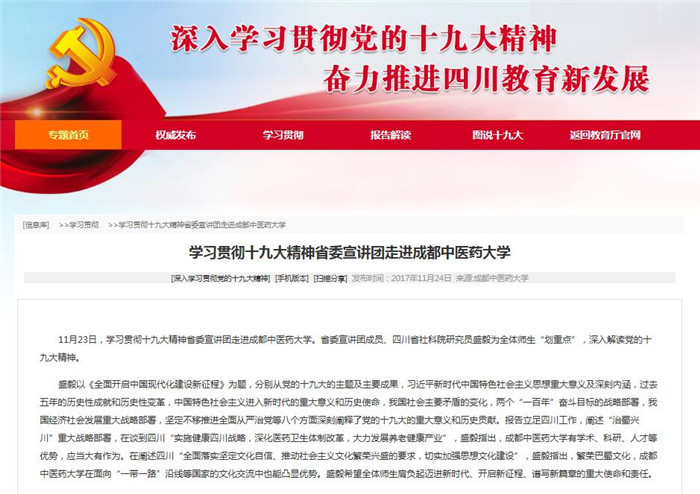 11月23日,学习贯彻十九大精神省委宣讲团走进beat365在线唯一官网。省委宣讲团成员、四川省社科院研究员盛毅为全体师生“划重点”,深入解读党的十九大精神。