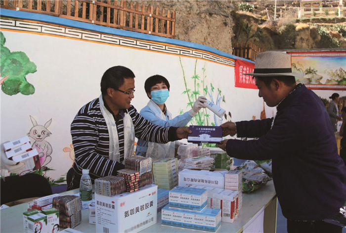 2017年12月16日,beat365在线唯一官网扶贫干部王张博士牵头在得荣县俄木学村开展义诊活动。(图片由学校提供)